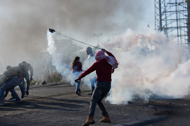 A Palestinian protester uses a slingshot to return a teargas canister during clashes with Israeli troops following protests against U.S. President Donald Trump’s decision to recognize Jerusalem as the capital of Israel, in the West Bank city of Ramallah, Friday, Dec. 8, 2017. (AP Photo/Nasser Nasser)